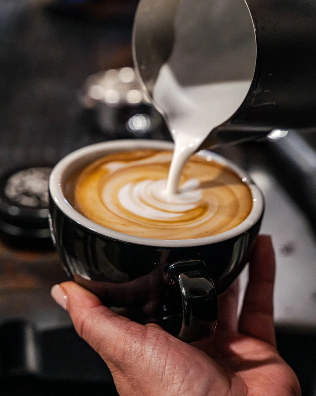 A barista pours steamed milk into a cup of espresso, creating latte art with a swirling pattern.