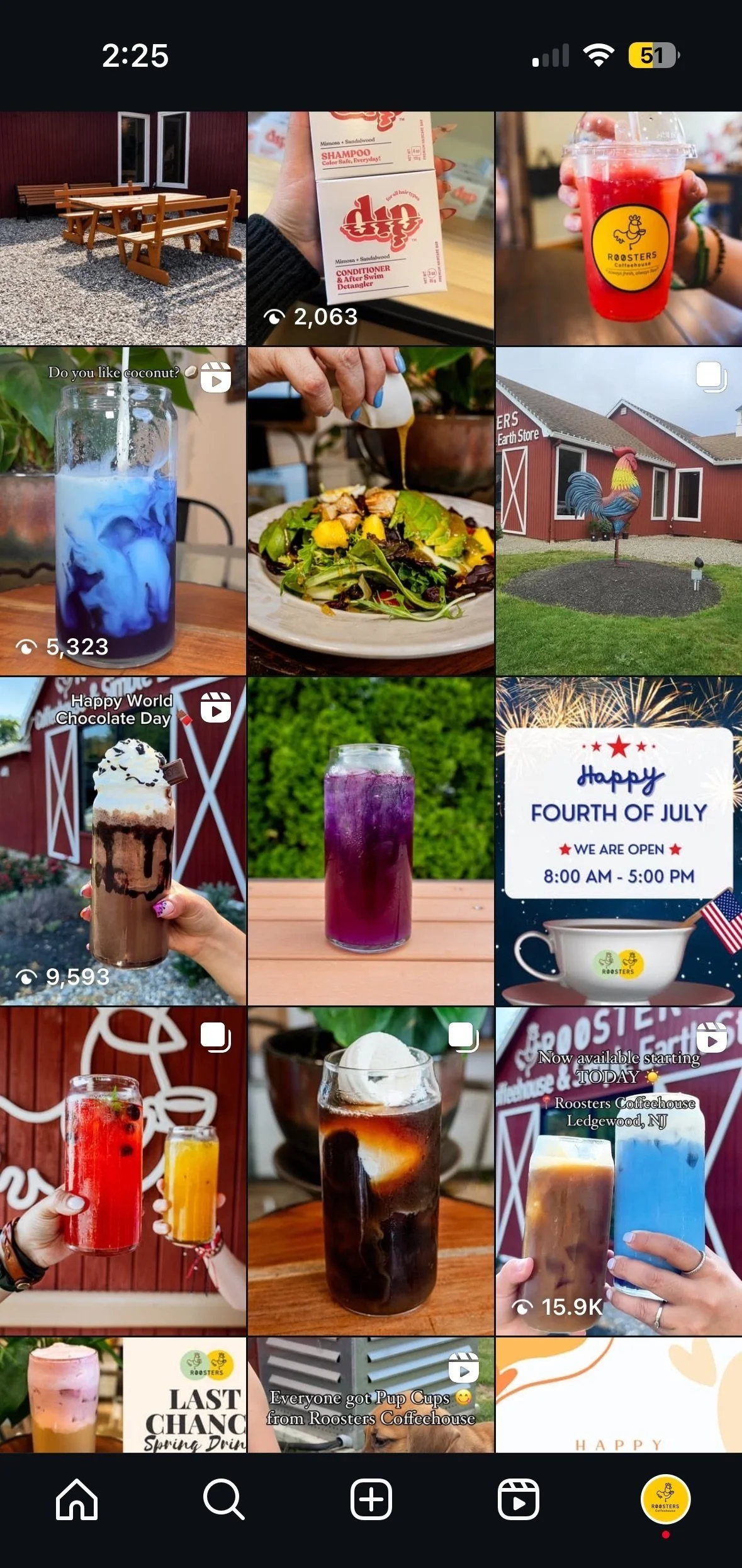 A collage of various food and drinks photos, including beverages, salads, and signs celebrating the Fourth of July, with a chicken statue and a red barn in the background.