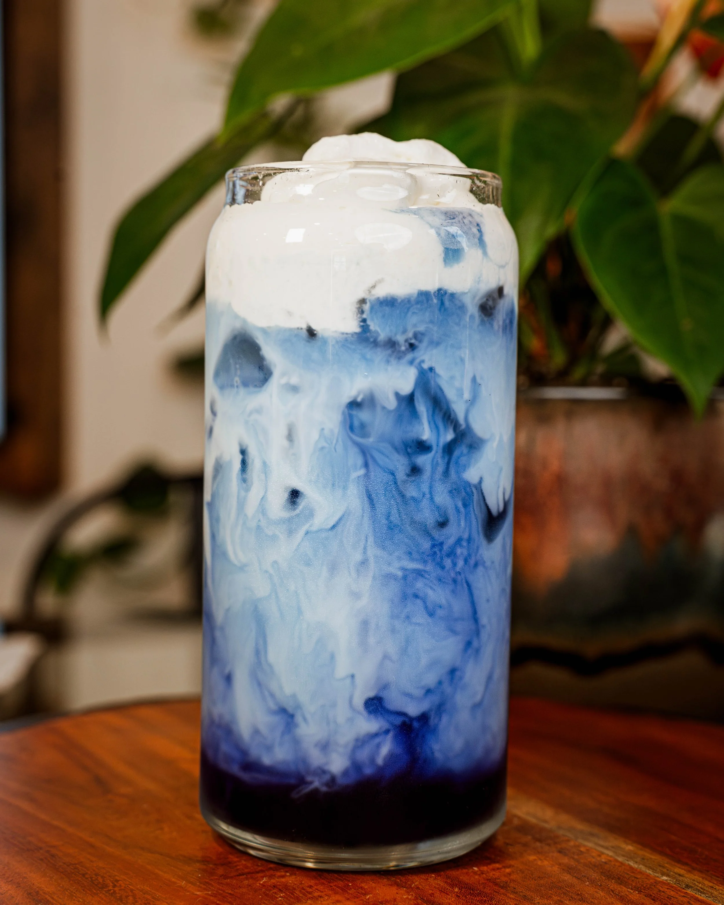 A tall glass filled with a blue and white swirling layered beverage topped with whipped cream, on a wooden table with green plant leaves in the background.