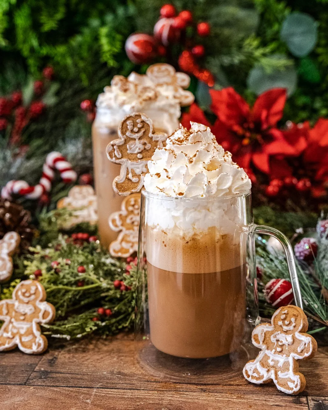 A glass mug of hot chocolate topped with whipped cream and sprinkled with cinnamon, surrounded by gingerbread cookies shaped like men and Christmas decorations including poinsettias, ornaments, candy canes, and evergreen branches.